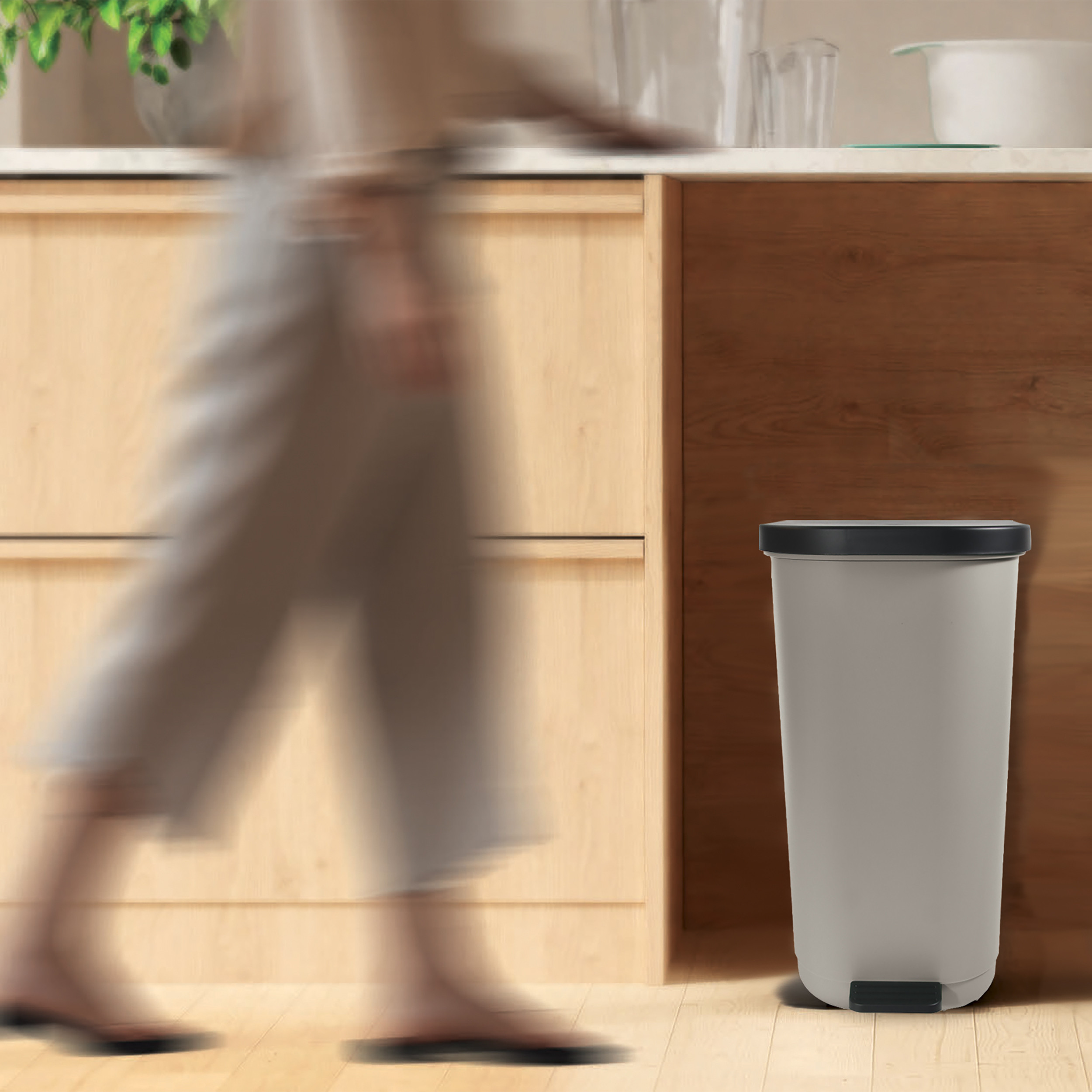 Der Abfallbehälter Harper vereint modernes Design und Alltagstauglichkeit. Er besteht aus recyceltem Polypropylen und bietet ein anpassbares Fassungsvermögen von 25 bis 40 Litern, wodurch er sich ideal für verschiedene Räume und Verwendungszwecke eignet: Küche, Badezimmer oder Büro.