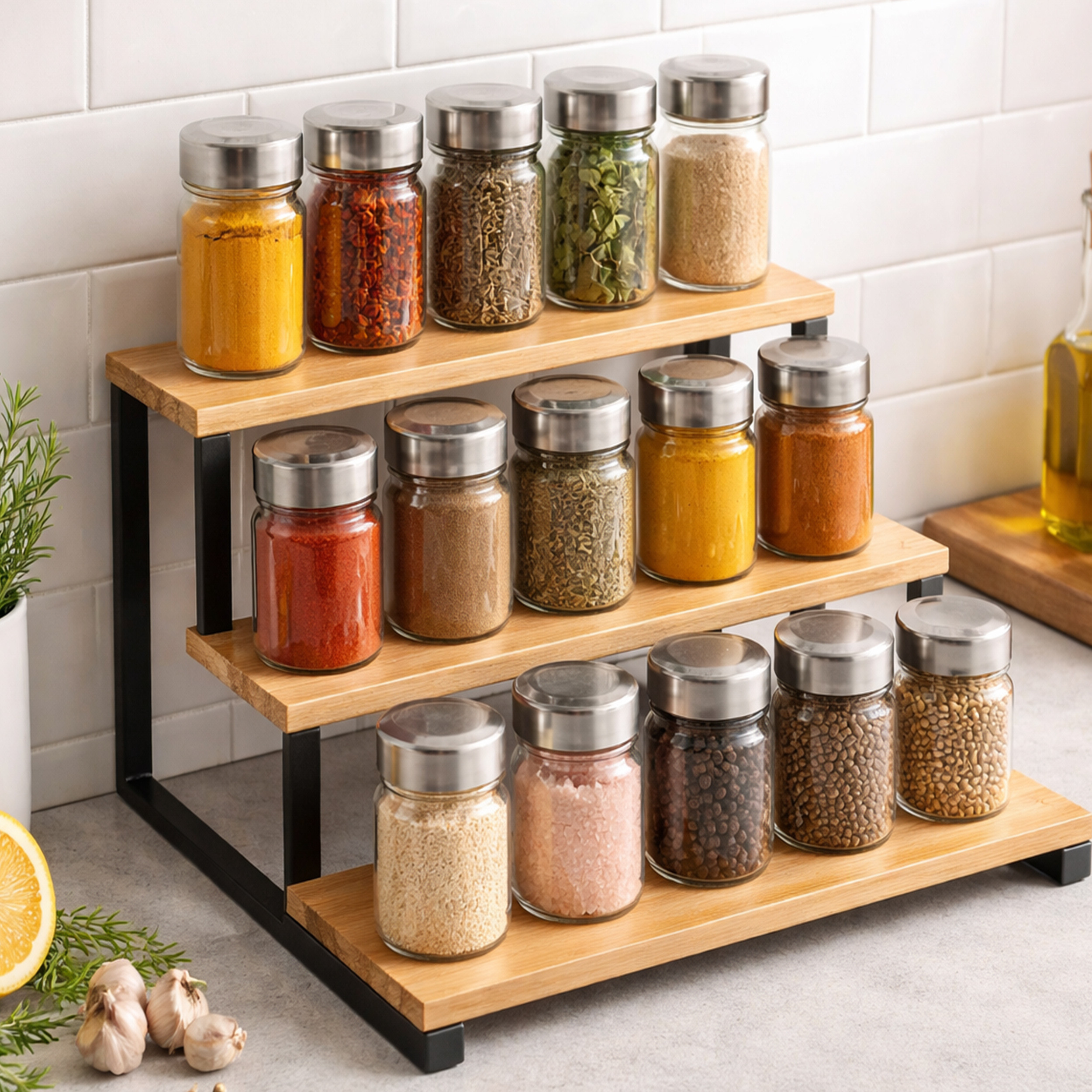 Estantería de 3 niveles de la marca MSV. Elegancia sencilla y belleza natural, la estantería ELIE es un verdadero objeto decorativo. ¡La mejor forma de guardar estos productos de cocina con estilo! Muy práctico para guardar con estilo tus botellas de especias, hierbas y aceite. Materiales de calidad: Este accesorio de cocina está fabricado en Acero y Bambú. Gracias a su diseño de calidad, te garantiza una larga vida de uso.