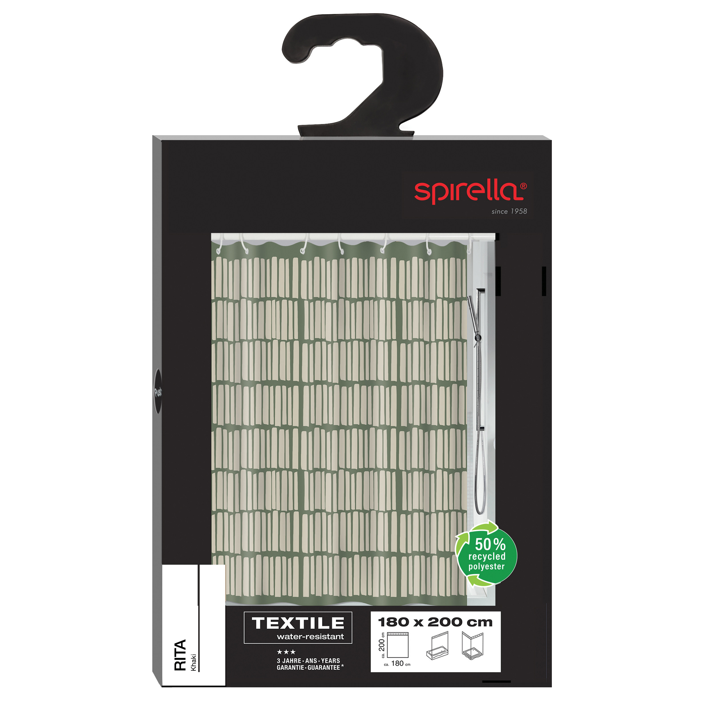 Associez style et fonctionnalité avec le rideau de douche Polyester RITA signé Spirella. Dimensions : 180x200cm. Fabriqué avec 50% de tissu recyclé, il est 100% hydrofuge, avec une bordure renforcée, des œillets robustes, et un ourlet lesté. Compatible avec la barre SURPRISE Spirella.