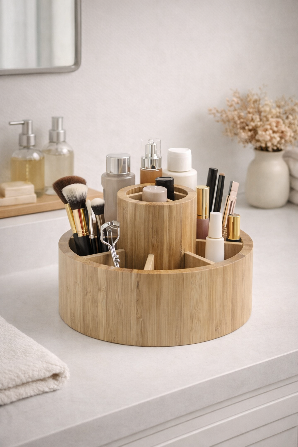 Cosmetic organizer from the MSV brand. Organizer for beauty products with clear storage for makeup, supplies, brushes, etc. Rotatable: rotatable 360° for good grip and easier access to your products. Storage space: 2 large and 4 small compartments for supplies. Multifunctional: In the office as a supply holder or in your beauty corner for storing your beauty products. Made from high-quality bamboo, this organizer stores all kinds of small items.