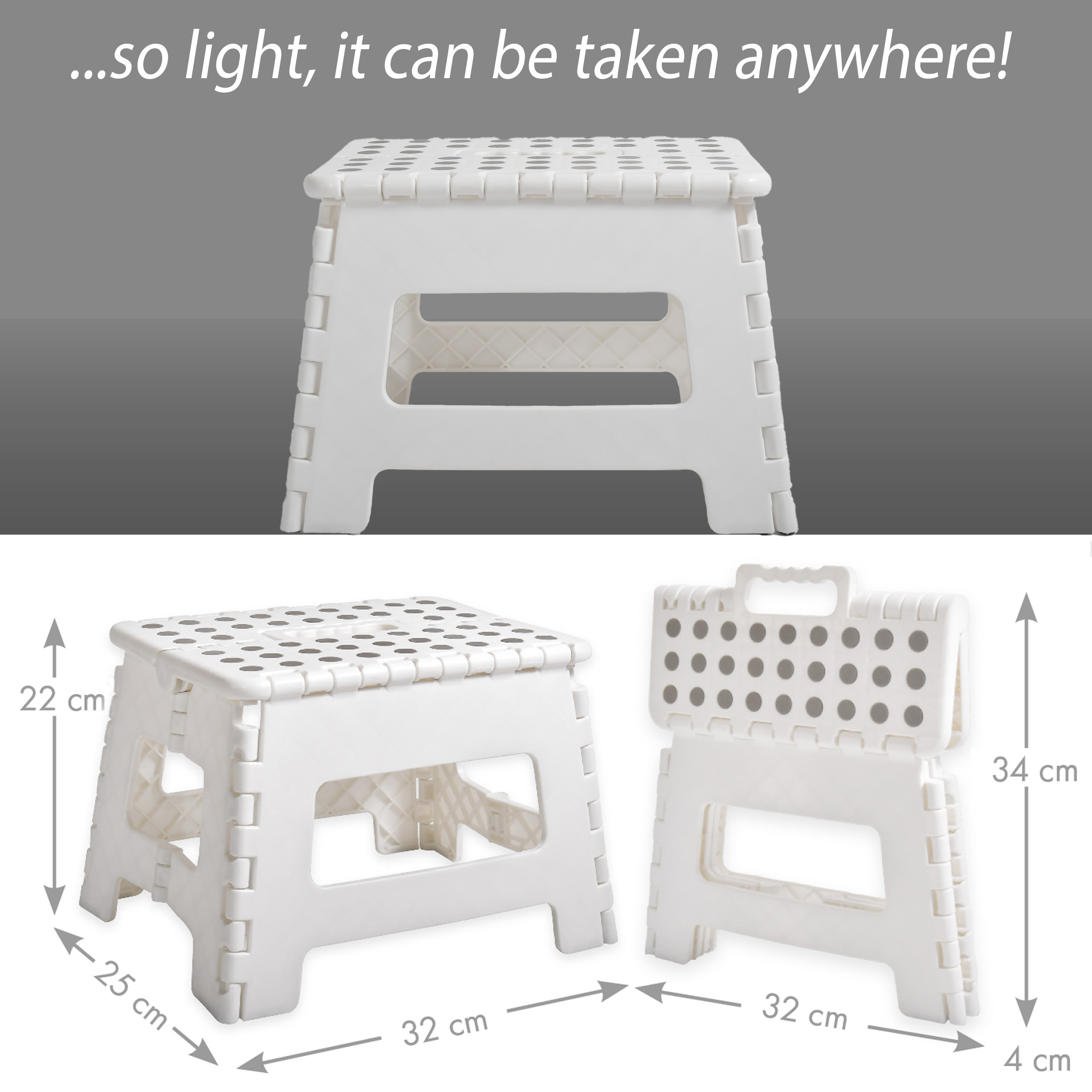 Molto pratico, lo sgabello è facilmente pieghevole e, una volta chiuso, misura solo 4 cm di spessore, permettendo di riporlo comodamente dietro una porta o in un armadio. La maniglia integrata facilita il trasporto e l’utilizzo sia da parte dei bambini che degli adulti.