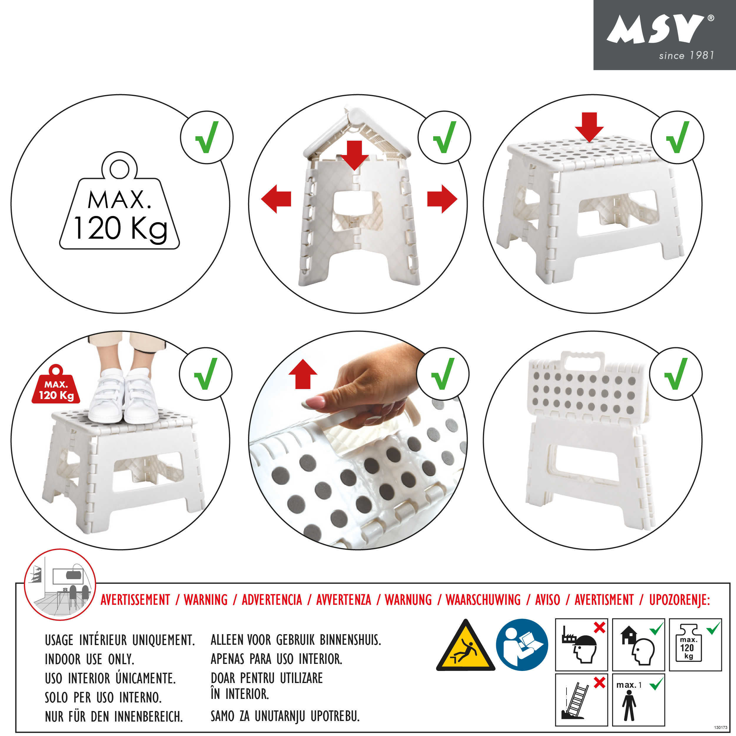 Grazie alla superficie antiscivolo e ai piedini antiscivolo, garantisce un’eccellente stabilità durante l’utilizzo. I bordi arrotondati e la struttura leggera lo rendono particolarmente adatto ai bambini. Conforme alla normativa EN 12520, supporta un carico massimo di 120 kg, assicurando un utilizzo affidabile e duraturo.