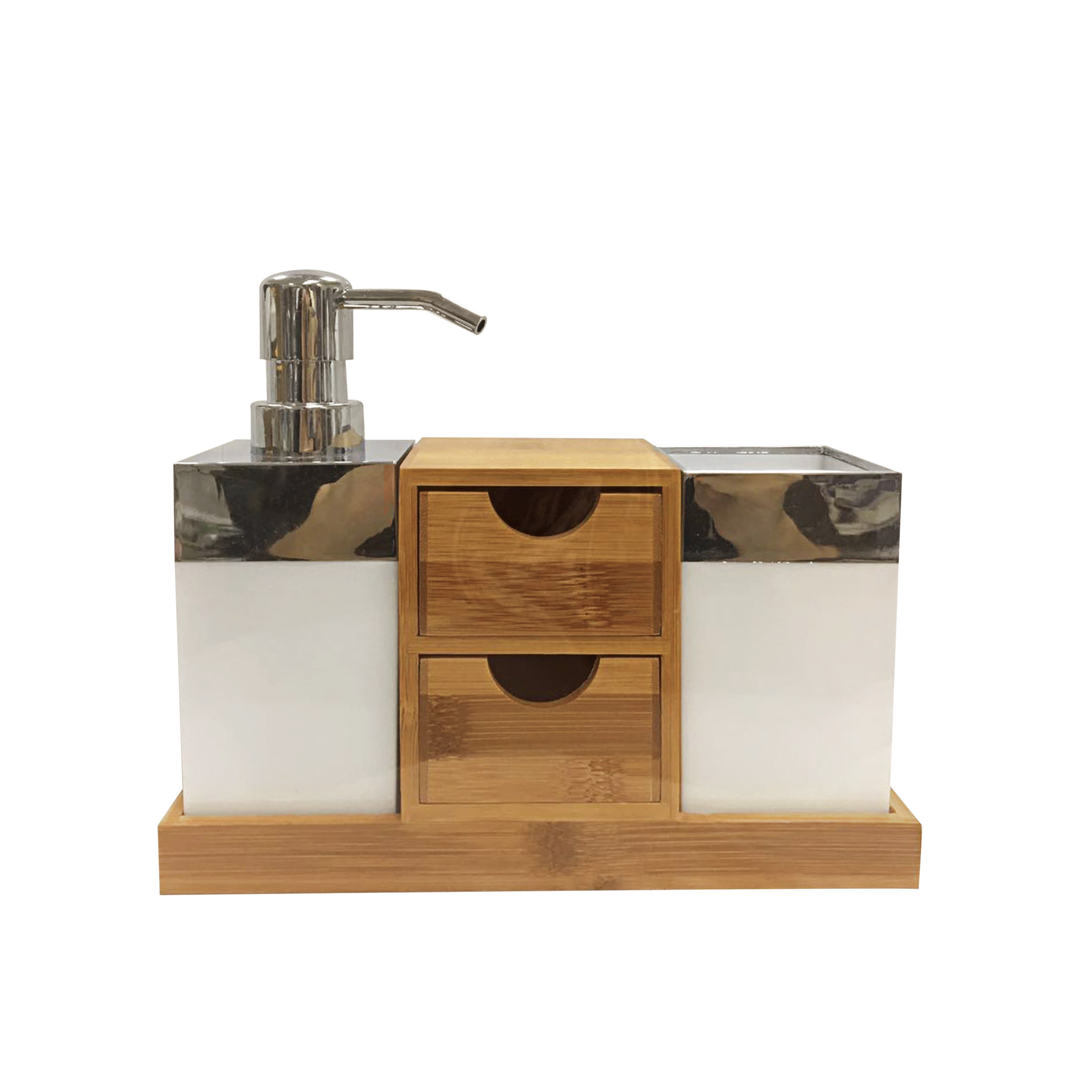 MSV Set di accessori da bagno della marca MSV. Elegante e pratico, questo set da bagno completo porterà un tocco di modernità al vostro bagno. Composto da un dispenser per sapone, 2 cassetti e una tazza. Compatto, questo Set è ideale per i piccoli spazi. Può anche essere scomposto e quindi utilizzare la base come piccolo vassoio per gioielli o altri piccoli oggetti di uso quotidiano. Dimensioni: 20,5x6,8x17 cm Colore: marrone e amp; Materiale bianco: bambù e amp; Acciaio inossidabile