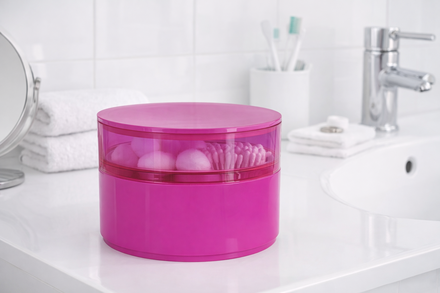 Cofanetto organizer di bellezza della marca Spirella. Un contenitore per accessori rotondo ed elegante. Adatto per riporre vari piccoli oggetti con 2 scomparti.